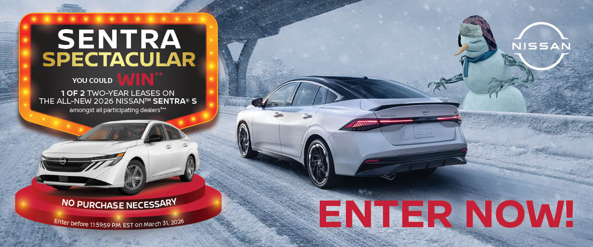 **NO PURCHASE NECESSARY. Subject to Official Rules at https://sentra.nissangiveaway.ca/official-rules, including the list of participating Ontario dealers. Contest closes at 11:59:59 P.M. EST on March 31, 2026. Open to legal Canadian residents who reside in the province of Ontario and are of the age of majority at time of entry. To enter, scan QR Code or enter the website domain found in this Contest advertisement and complete the entry form. There is a limit one (1) entry per person during the Contest Period regardless of how many advertisements you may see or participating dealerships that are near your home location. Two (2) prizes are available to be won amongst all participating NISSANTM Ontario dealers, consisting of a two (2) year lease of a 2026 NISSANTM Sentra® S vehicle with a total of 32,000km during the lease term. The approximate retail value of each Prize including applicable taxes on the vehicle, provincial sales tax; freights, AC tax, OMVIC Fee, tire tax; environment fee, administration fees including pre-delivery inspection charges is $11,412.00 CAD. Odds of winning a Prize depends on the total number of eligible entries received amongst all participating NISSANTM dealers in Ontario on or before the Contest Closing Date. Random draw held on April 13, 2026. Each selected entrant must correctly answer a mathematical skill-testing question and complete a Declaration of Compliance / Release of Liability and Consent to Publicity Form.